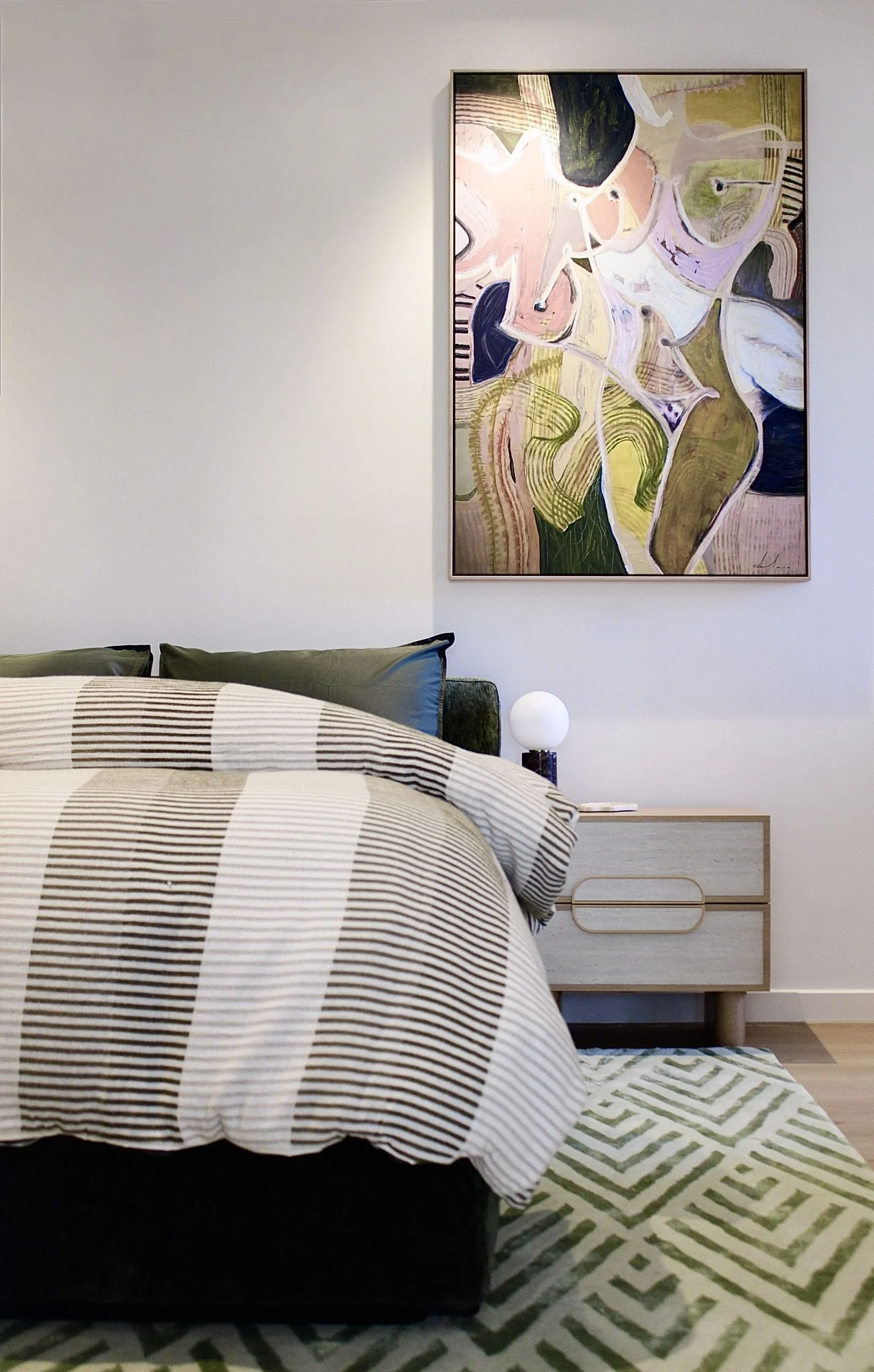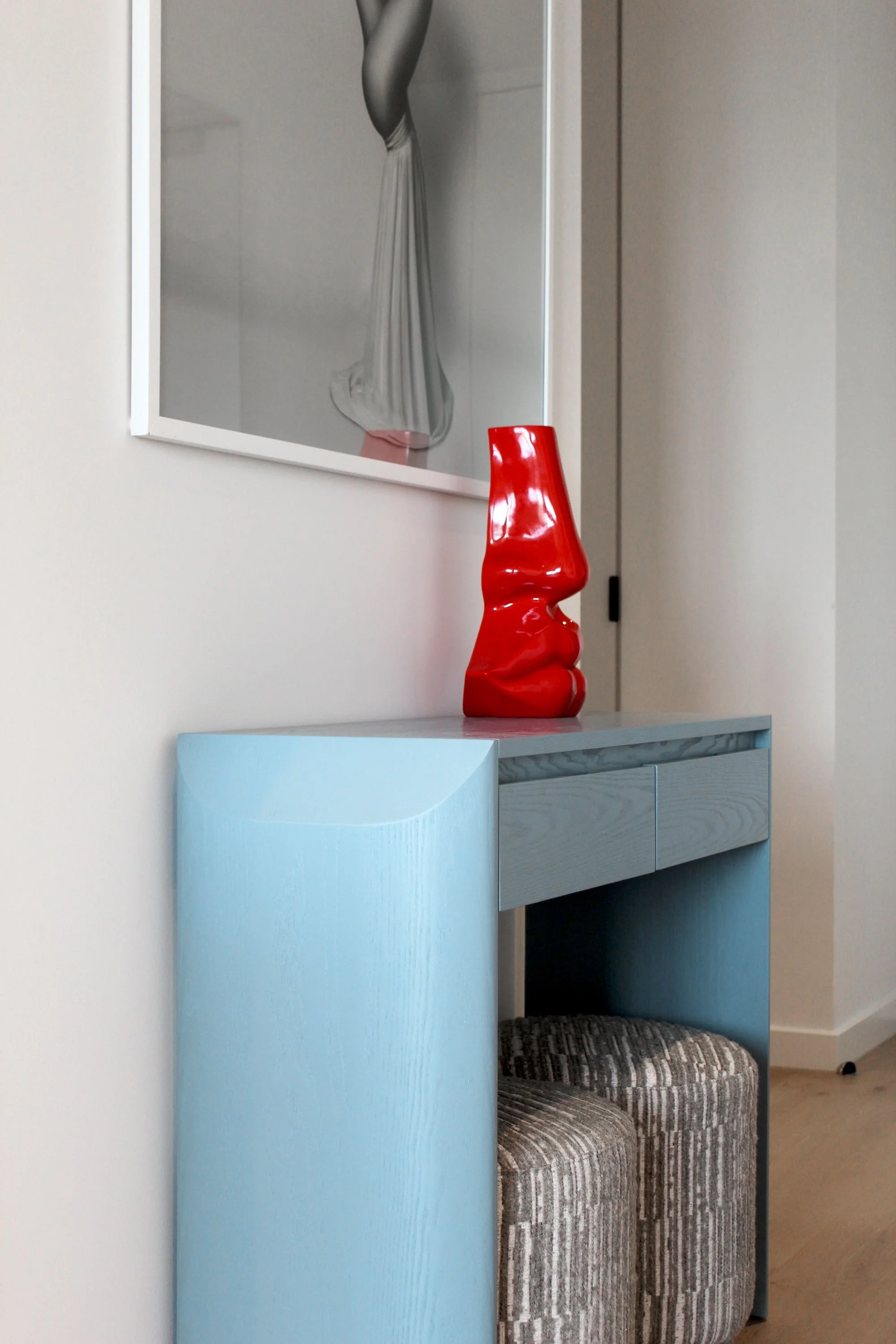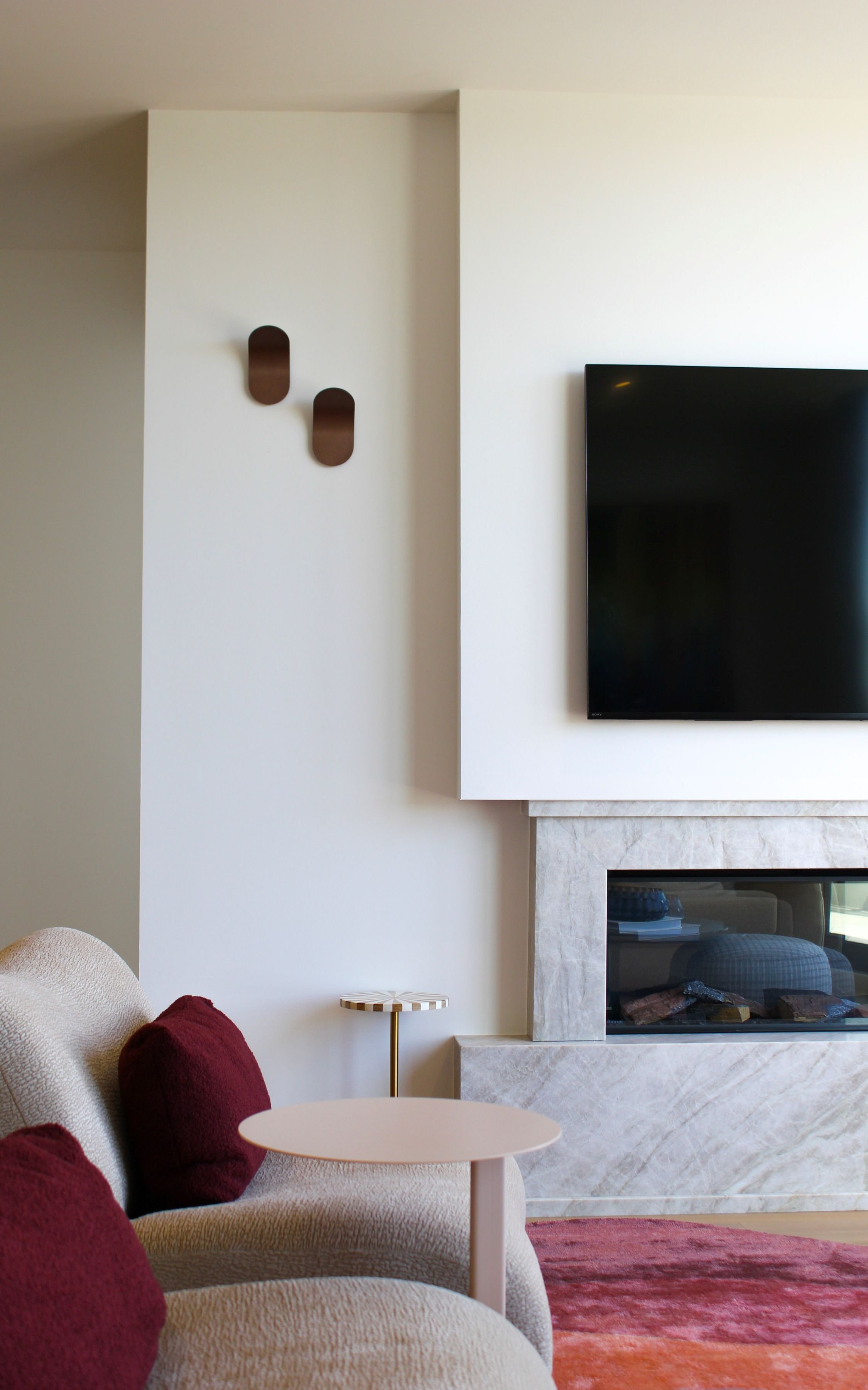 This Mornington coastal apartment started as a simple two-bedroom getaway, and through Studio Carlyle’s spatial reconfiguration it became a playful, luxurious three-bedroom retreat designed for long Australian summers. We carved the third bedroom from an oversized living zone, added a custom fireplace and replaced the carpet with timber boards chosen to balance the existing kitchen tones and the shifting coastal light. The fun came through our patterned custom-designed rugs, and a mix of bold, warm colours that lifted the whole apartment into a more energetic rhythm.